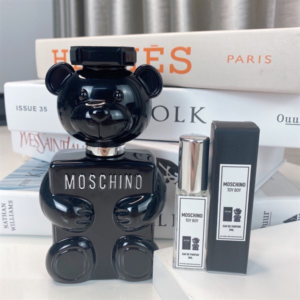 Toy Boy là dòng nước hoa nam của thương hiệu Moschino mới được ra mắt vào năm 2019 và được thiết kế bởi giám đốc sáng tạo Jeremy Scott. Toy Boy diễn giải về một người đàn ông tự tin, năng động, đầy hoài bão và đam mê, nhưng không ngại thể hiện khía cạnh hóm hỉnh và hài hước của bản thân. Được chuyên gia nước hoa hàng đầu Yann Vasnier sáng tạo ra, Moschino Toy Boy thể hiện được đầy đủ sự tinh quái của ông cách tạo hương của ông, khi hương đầu là sự kết hợp mới lạ giữa sự tươi mát của Cam bergamot, trái lê và vị ấm nồng của hồng tiêu. Và mặc dù là nước hoa nam, trái tim của Toy Boy lại phủ đầy các note hương hoa đầy quyến rũ. Toy Boy thể hiện được sự trầm ngâm và nam tính nhất khi yên vị trên da ở tầng hương cuối, nơi có sự giao thoa mạnh mẽ giữa cỏ Vetiver và hương gỗ Cashmeran. Được đánh giá là một chai nước hoa khó phán đoán và xác định được các tầng hương cụ thể, Toy Boy còn gây ấn tượng mạnh với thiết kế đậm chất lạ của Moschino.