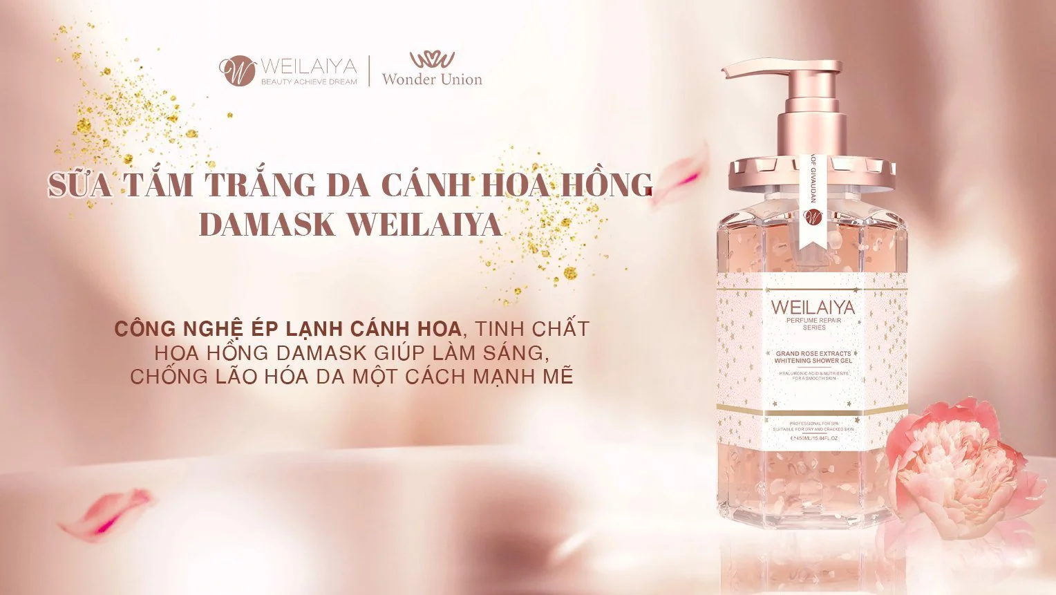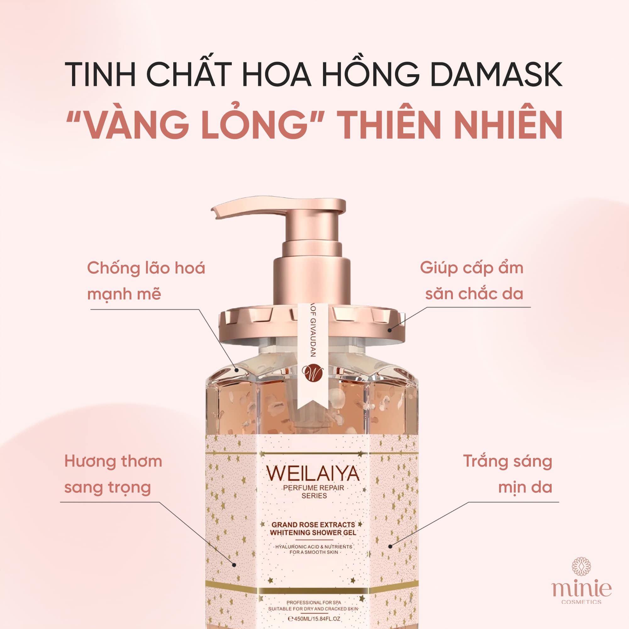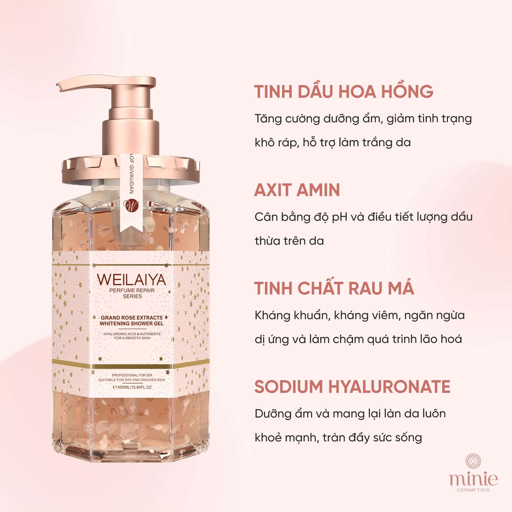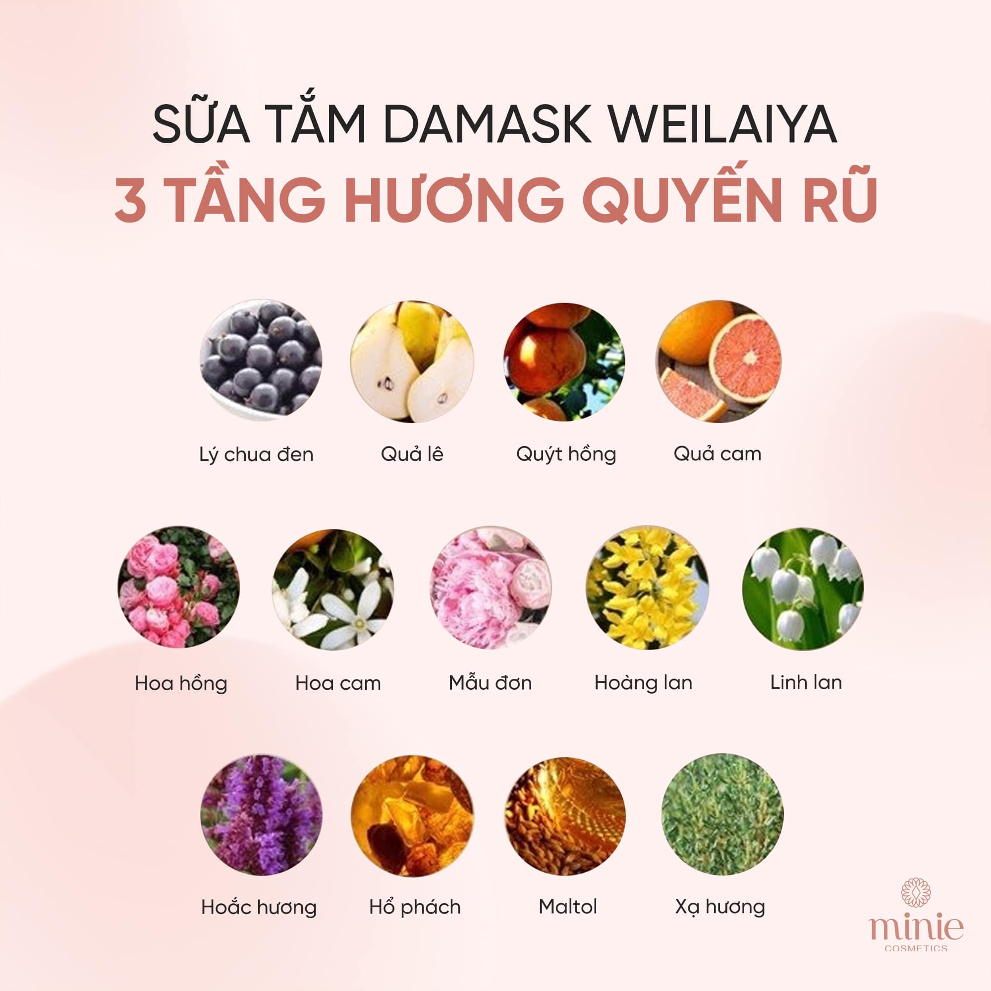 - Ngoài tinh dầu hoa hồng Damask, sữa tắm cánh hoa Weilaiya còn giàu axit amin, tinh chất rau má, Sodium Hyaluronate giúp:
